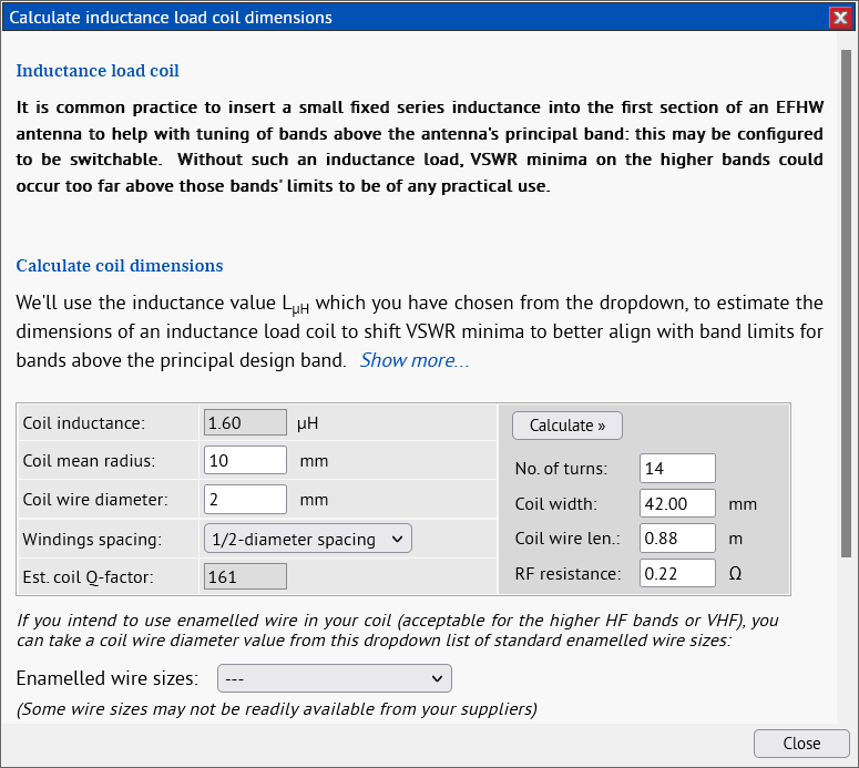A new set of controls has been added to the vertical antenna designer with which you can specify a new, shortened, length for your antenna, and with which you can calculate the inductance and dimensions of a suitable loading coil. Just choose the "1/4-wave vertical..." configuration from the dropdown, and activate the "Shortened length" radio button provided - a new sub-section in the main antenna setup section will appear.