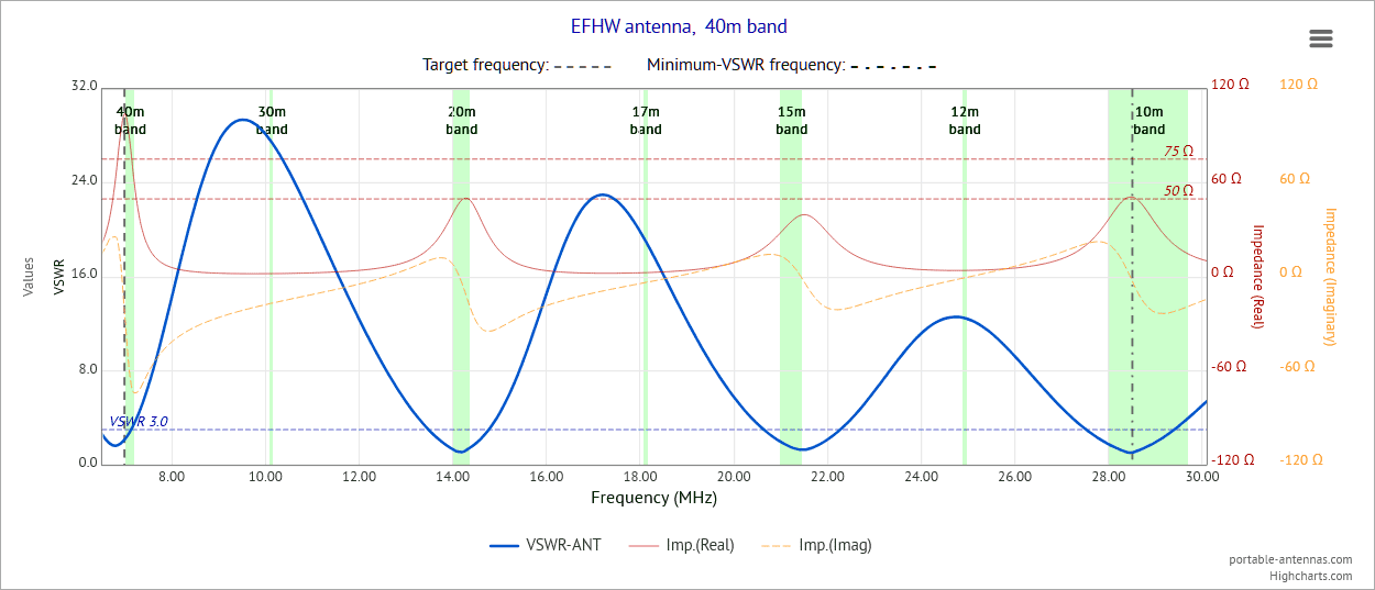 The EFHW antenna designer page enables the user to quickly design either a multi-band EFHW (end-fed half-wave) or EFRL (end-fed random-length) antenna for portable use in the field, or on a mountain top. Such antennas consist basically of one single wire having: