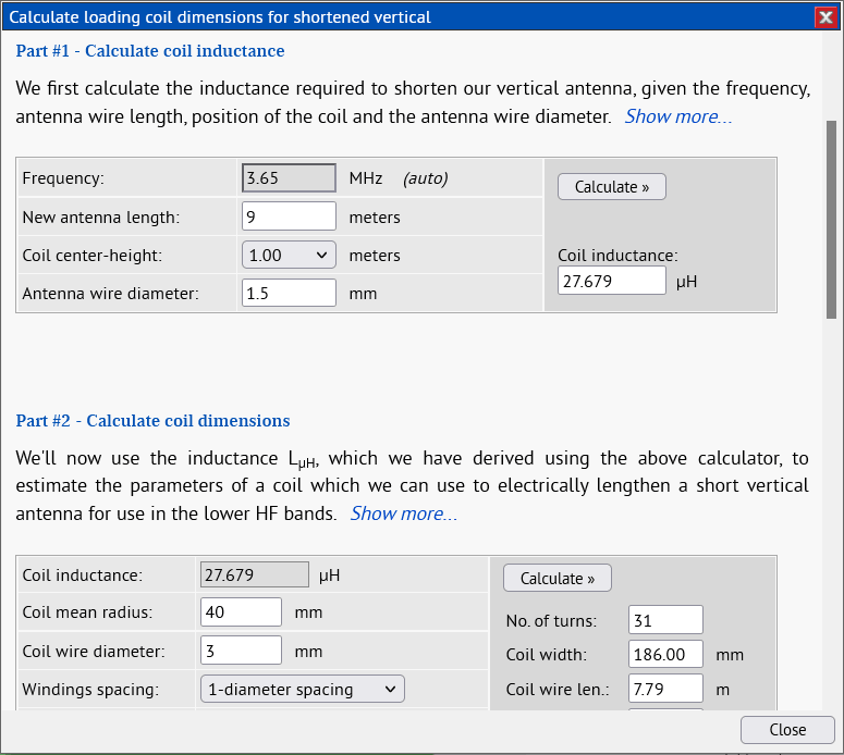 A new set of controls has been added to the vertical antenna designer with which you can specify a new, shortened, length for your antenna, and with which you can calculate the inductance and dimensions of a suitable loading coil. Just choose the "1/4-wave vertical..." configuration from the dropdown, and activate the "Shortened length" radio button provided - a new sub-section in the main antenna setup section will appear.