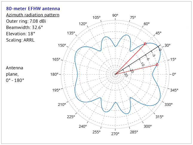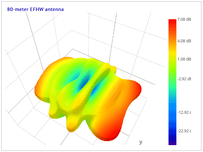 For this discussion, we show a simplified version of a 3D radiation pattern: one for a 40-meter EFHW antenna (a multi-band antenna) being used on one of its' resonant bands, the 10-meter band. This antenna is set out in an east-west direction, so that the antenna wires are in the 0° - 180° vertical plane.