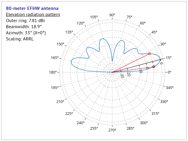 Let's look at an example antenna, an 80-meter EFHW inverted-L, to see how the size of the antenna compares to the size of its' radiation patterns. First, the antenna itself: